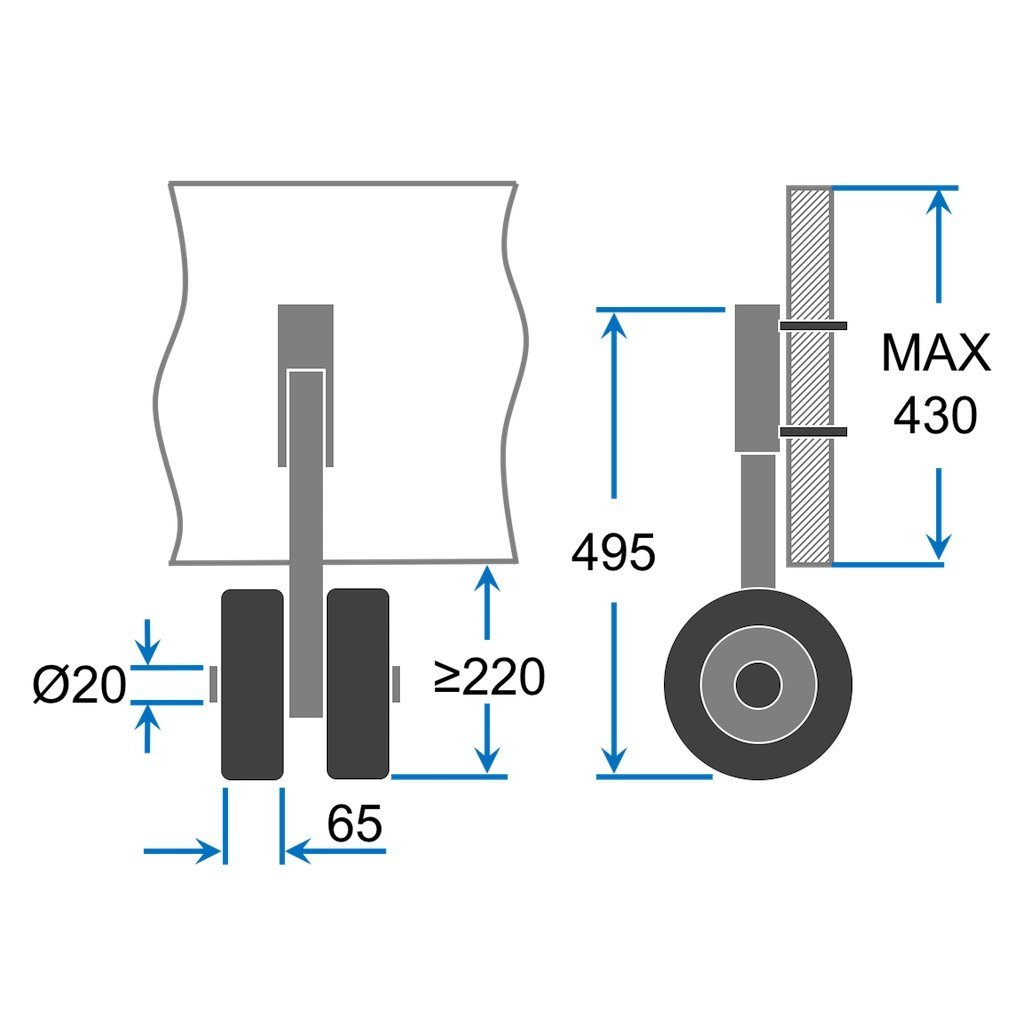 Materiál: nehrdzavejúca oceľ V2AVeľkosť koliesok: Ø 200 mmŠírka kolesa: 65 mmPneumatika: polyuretánŠírka priečok: min. 400 mmVýška zadného priečneho nosníka: 140 – 430 mmÚroveň priečky: max. 40 mmNosnosť (na pár): ~ 160 kgHmotnosť: ~ 5 kgRozmery: pozri obrázok