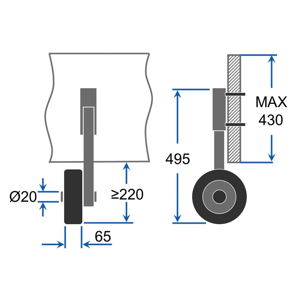Materiál: nehrdzavejúca oceľ V2AVeľkosť koliesok: Ø 200 mmŠírka kolesa: 65 mmPneumatika: polyuretánŠírka priečok: min. 250 mmVýška zadného priečneho nosníka: 140 – 430 mmÚroveň priečky: max. 40 mmNosnosť (na pár): ~ 140 kgHmotnosť: ~ 3,5 kgRozmery: pozri obrázok