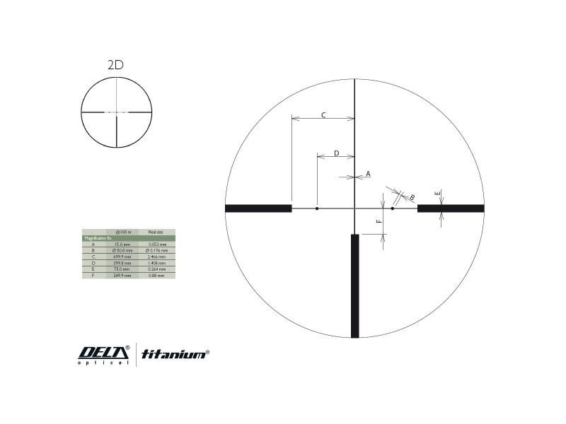 Puškohľad Delta Titanium 2,5-15×50 HD SF sa zaraďuje k elite medzi puškohľadmi. Puškohľad poskytuje svetelnosť až 92%. Má pevnú, precízne spracovanú konštrukciu. Puškohľad Delta sa vyznačuje extrémnou odolnosťou voči spätnému rázu, a to až 6500 J. Puškohľad je testovaný na kalibroch 9,3 x 62. Jemný červený zámerný bod v strede osnovy pomôže presne zamerať cieľ i v tých najťažších svetelných podmienkach. Tubus puškohľadu je vyrobený z jedného dielu a upravený čiernou anodizáciou. Puškohľad je utesnený voči prachu je vodeodolný, a utesnený proti zahmlievaniu.
