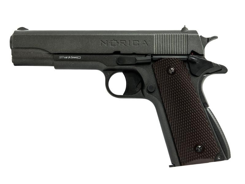 Rámy vzduchových pištolí NORICA sú vyrábané rovnako kvalitne ako vzduchovkách to im zaručuje odolnosť a dlhú životnosť. Výhodou vzduchových pištolí na CO2 bombičky je ich pohodlnosť pri streľbe bez potreby naťahovať pružinu, či prebíjať po každom výstrele. Jednoducho vložíte CO2 bombičku so zásobníkom a strieľate. Presná replika známej zbrane 1911. Integrovaná lišta umožňuje upevnenie taktického príslušenstva, ako je laser alebo baterka kompatibilná s picatinny montážou. Táto pištoľ umožňuje pohodlné uchopenie a následne vyššiu presnosť aj pre neskúseného strelca. Na ďalšie zlepšenie priľnavosti má rukoväť vybratie prstov a textúrovanú rebrovanú gumu. Pištoľ strieľa 4,5 mm BB. Poháňané kapsulou obsahujúcou 12 g CO2 umiestnenou vo vnútri 12 ranového zásobníka BB.
